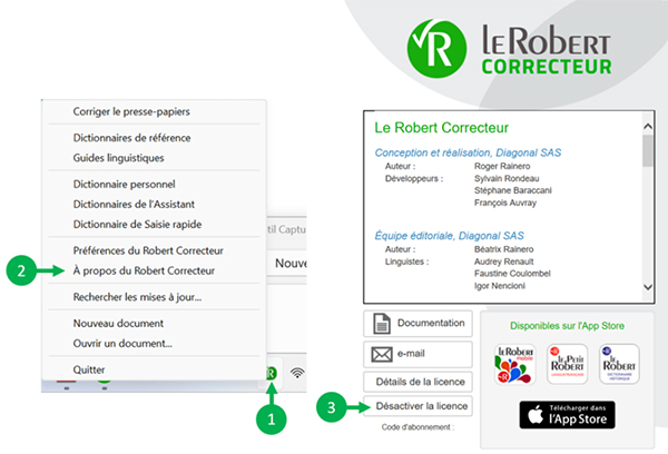 2 Cliquez sur « À propos du Robert Correcteur » : notez bien votre « Code abonnement » ou « Code d’achat » (que vous pouvez aussi retrouver dans le courriel reçu lors de votre souscription ou achat). Il vous servira pour réinstaller votre licence sur un autre poste.